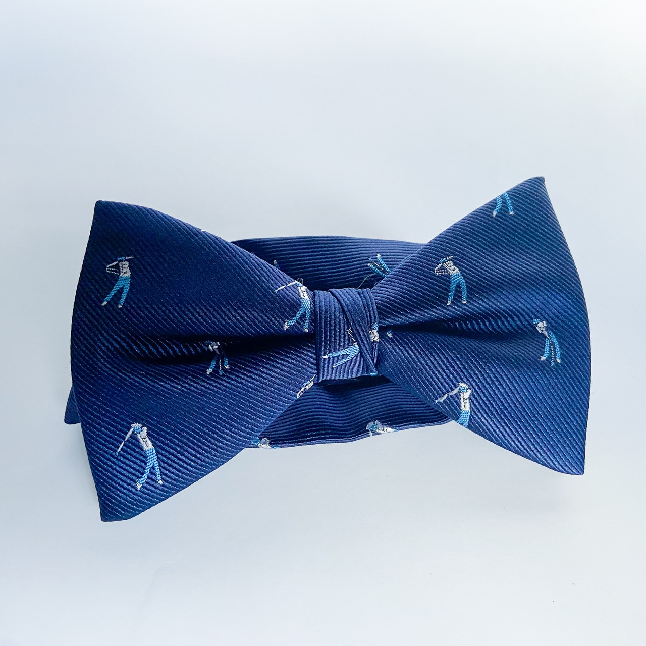 ゴルフモチーフ柄が目を引く、おしゃれな蝶ネクタイ。カジュアルな装いにもビシっと決まる一本で、あなたのスタイリングをワンランクアップしてくれること間違いなし。おしゃれで遊び心あるデザインで、結婚式やパーティーなどにもおすすめです。